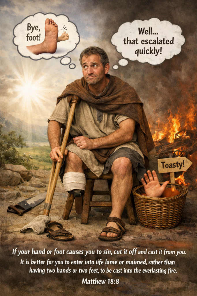 “If your hand or foot causes you to sin, cut it off and cast it from you. It is better for you to enter into life lame or maimed, rather than having two hands or two feet, to be cast into the everlasting fire. Matthew 18:8