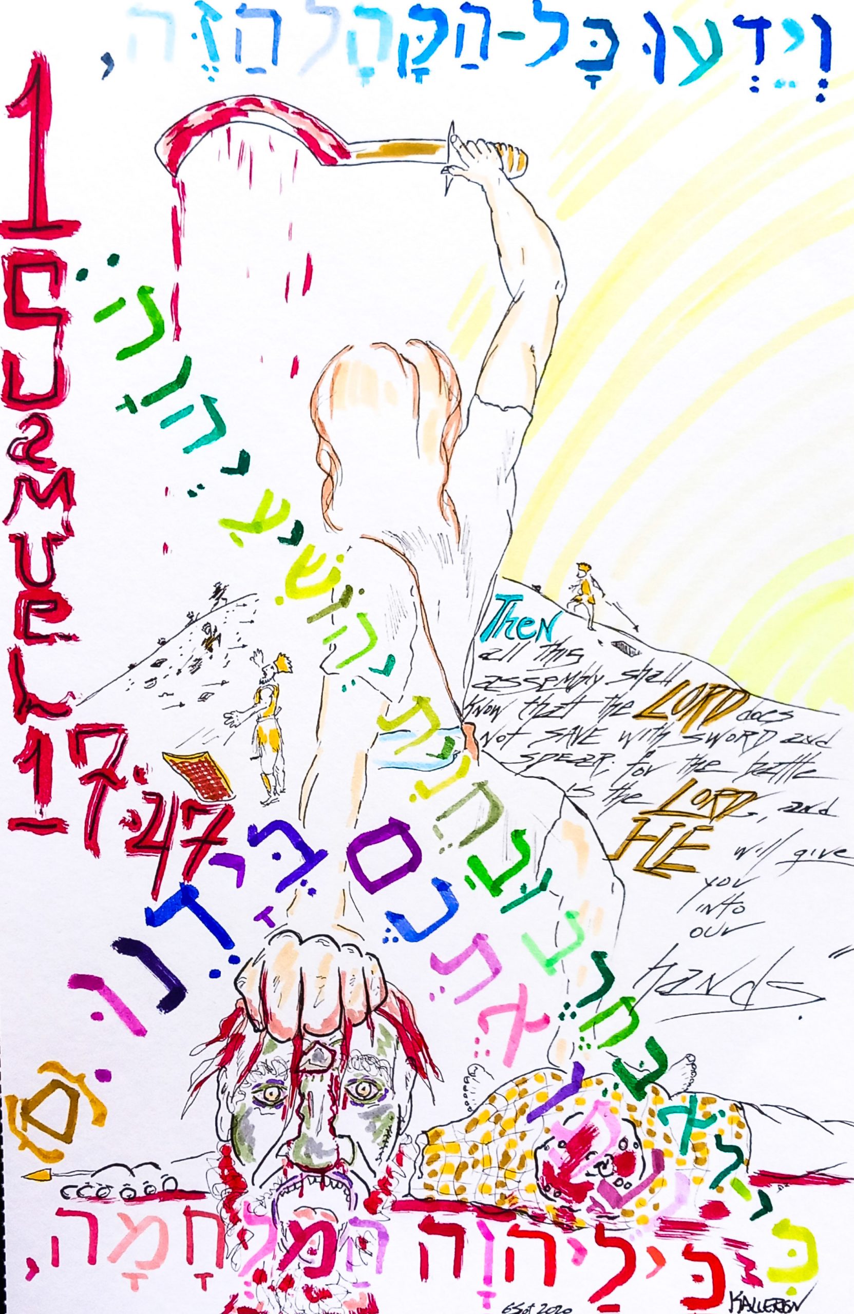 veyedeu kal ha’qahal ha’zeh ki lo bekherev u-vankhanith yehoshia Yehovah – “And they will know, all the assembly, the this, for not in sword and in the spear, He will cause to save, Yehovah.” The implements of battle used by Goliath are unnecessary for the Lord to gain the victory.
